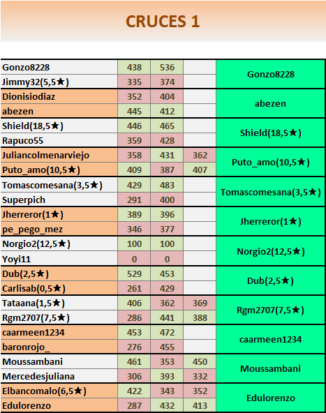 Hola, hay un error en los resultados del cruce Elbancomalo con Edulorenzo. El resultado de la última partida está al revés, fui yo el ganador. Ya no puedo ver mi mensaje, pero juraría que lo envié bien. Ruego lo corrijáis y me pongáis a mí en el cuadro de cruces 2.