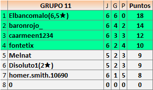Deja un comentarioEn está página se irán publicando los resultados de las diferentes partidas, siendo ambos jugadores responsables de subirlos o de comprobar que ya hayan sido publicados insertando un COMENTARIO en la parte inferior de la pantalla (opción “Deja tu comentario”), indicando el nombre de los dos jugadores y los puntos obtenidos en la partida.