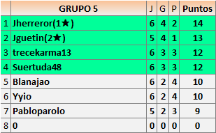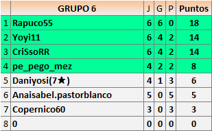 Deja un comentarioEn está página se irán publicando los resultados de las diferentes partidas, siendo ambos jugadores responsables de subirlos o de comprobar que ya hayan sido publicados insertando un COMENTARIO en la parte inferior de la pantalla (opción “Deja tu comentario”), indicando el nombre de los dos jugadores y los puntos obtenidos en la partida.
