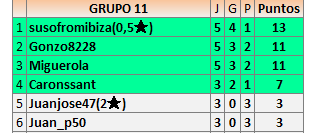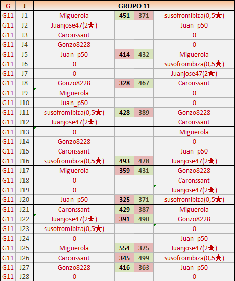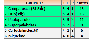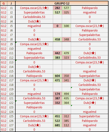 Deja un comentarioEn está página se irán publicando los resultados de las diferentes partidas, siendo ambos jugadores responsables de subirlos o de comprobar que ya hayan sido publicados insertando un COMENTARIO en la parte inferior de la pantalla (opción “Deja tu comentario”), indicando el nombre de los dos jugadores y los puntos obtenidos en la partida.