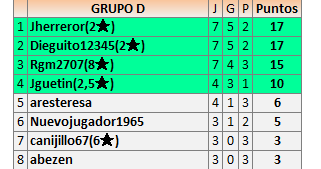 Deja un comentarioEn está página se irán publicando los resultados de las diferentes partidas, siendo ambos jugadores responsables de subirlos o de comprobar que ya hayan sido publicados insertando un COMENTARIO en la parte inferior de la pantalla (opción “Deja tu comentario”), indicando el nombre de los dos jugadores y los puntos obtenidos en la partida.
