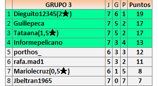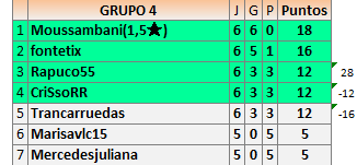 Deja un comentarioEn está página se irán publicando los resultados de las diferentes partidas, siendo ambos jugadores responsables de subirlos o de comprobar que ya hayan sido publicados insertando un COMENTARIO en la parte inferior de la pantalla (opción “Deja tu comentario”), indicando el nombre de los dos jugadores y los puntos obtenidos en la partida.