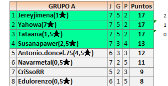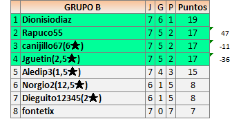 Hacemos notar que en el grupo A , Antonio.doncel con una derrota más se hubiera clasificado, pero solo subió sus victorias y no las derrotas , costumbre que tienen algunos jugadores y que a veces , como en esta ocasión , tiene un resultado muy adverso