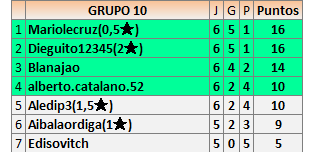 Deja un comentarioEn está página se irán publicando los resultados de las diferentes partidas, siendo ambos jugadores responsables de subirlos o de comprobar que ya hayan sido publicados insertando un COMENTARIO en la parte inferior de la pantalla (opción “Deja tu comentario”), indicando el nombre de los dos jugadores y los puntos obtenidos en la partida.
