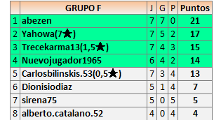 Deja un comentarioEn está página se irán publicando los resultados de las diferentes partidas, siendo ambos jugadores responsables de subirlos o de comprobar que ya hayan sido publicados insertando un COMENTARIO en la parte inferior de la pantalla (opción “Deja tu comentario”), indicando el nombre de los dos jugadores y los puntos obtenidos en la partida.