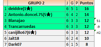 Deja un comentarioEn está página se irán publicando los resultados de las diferentes partidas, siendo ambos jugadores responsables de subirlos o de comprobar que ya hayan sido publicados insertando un COMENTARIO en la parte inferior de la pantalla (opción “Deja tu comentario”), indicando el nombre de los dos jugadores y los puntos obtenidos en la partida.