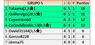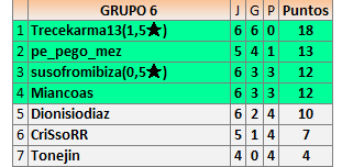 Deja un comentarioEn está página se irán publicando los resultados de las diferentes partidas, siendo ambos jugadores responsables de subirlos o de comprobar que ya hayan sido publicados insertando un COMENTARIO en la parte inferior de la pantalla (opción “Deja tu comentario”), indicando el nombre de los dos jugadores y los puntos obtenidos en la partida.