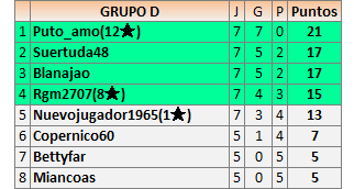 Deja un comentarioEn está página se irán publicando los resultados de las diferentes partidas, siendo ambos jugadores responsables de subirlos o de comprobar que ya hayan sido publicados insertando un COMENTARIO en la parte inferior de la pantalla (opción “Deja tu comentario”), indicando el nombre de los dos jugadores y los puntos obtenidos en la partida.