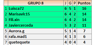 Deja un comentarioEn está página se irán publicando los resultados de las diferentes partidas, siendo ambos jugadores responsables de subirlos o de comprobar que ya hayan sido publicados insertando un COMENTARIO en la parte inferior de la pantalla (opción “Deja tu comentario”), indicando el nombre de los dos jugadores y los puntos obtenidos en la partida.