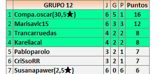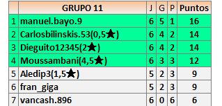 Deja un comentarioEn está página se irán publicando los resultados de las diferentes partidas, siendo ambos jugadores responsables de subirlos o de comprobar que ya hayan sido publicados insertando un COMENTARIO en la parte inferior de la pantalla (opción “Deja tu comentario”), indicando el nombre de los dos jugadores y los puntos obtenidos en la partida.