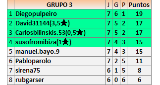 Deja un comentarioEn está página se irán publicando los resultados de las diferentes partidas, siendo ambos jugadores responsables de subirlos o de comprobar que ya hayan sido publicados insertando un COMENTARIO en la parte inferior de la pantalla (opción “Deja tu comentario”), indicando el nombre de los dos jugadores y los puntos obtenidos en la partida.