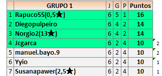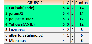 Deja un comentarioEn está página se irán publicando los resultados de las diferentes partidas, siendo ambos jugadores responsables de subirlos o de comprobar que ya hayan sido publicados insertando un COMENTARIO en la parte inferior de la pantalla (opción “Deja tu comentario”), indicando el nombre de los dos jugadores y los puntos obtenidos en la partida.