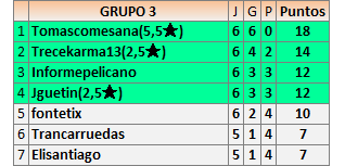 Deja un comentarioEn está página se irán publicando los resultados de las diferentes partidas, siendo ambos jugadores responsables de subirlos o de comprobar que ya hayan sido publicados insertando un COMENTARIO en la parte inferior de la pantalla (opción “Deja tu comentario”), indicando el nombre de los dos jugadores y los puntos obtenidos en la partida.