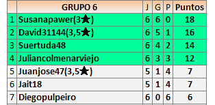 Deja un comentarioEn está página se irán publicando los resultados de las diferentes partidas, siendo ambos jugadores responsables de subirlos o de comprobar que ya hayan sido publicados insertando un COMENTARIO en la parte inferior de la pantalla (opción “Deja tu comentario”), indicando el nombre de los dos jugadores y los puntos obtenidos en la partida.