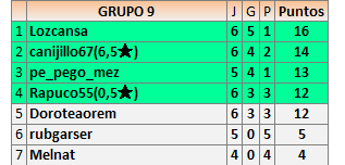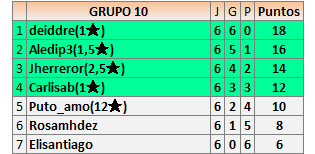 Deja un comentarioEn está página se irán publicando los resultados de las diferentes partidas, siendo ambos jugadores responsables de subirlos o de comprobar que ya hayan sido publicados insertando un COMENTARIO en la parte inferior de la pantalla (opción “Deja tu comentario”), indicando el nombre de los dos jugadores y los puntos obtenidos en la partida.