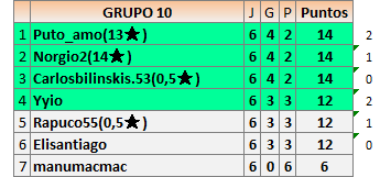 Deja un comentarioEn está página se irán publicando los resultados de las diferentes partidas, siendo ambos jugadores responsables de subirlos o de comprobar que ya hayan sido publicados insertando un COMENTARIO en la parte inferior de la pantalla (opción “Deja tu comentario”), indicando el nombre de los dos jugadores y los puntos obtenidos en la partida.