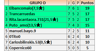 Deja un comentarioEn está página se irán publicando los resultados de las diferentes partidas, siendo ambos jugadores responsables de subirlos o de comprobar que ya hayan sido publicados insertando un COMENTARIO en la parte inferior de la pantalla (opción “Deja tu comentario”), indicando el nombre de los dos jugadores y los puntos obtenidos en la partida.