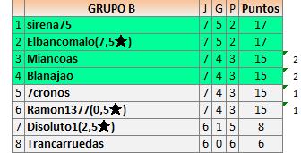 Para que podamos organizar los torneos adecuadamente necesitamos de vuestra colaboración y una de las partes más importante es INFORMAR, lógicamente dentro del plazo, Preferimos jugadores que pierdan todas la partidas pero nos lo digan que otros( que los hay) que ganan muchas partidas o casi todas pero por despiste o que están muy ocupados se olvidan de poner los resultados, de hecho al que pierde se le da 1 punto mientras al que gana y lo manda fuera de plazo o no lo manda se le dan 0 puntos