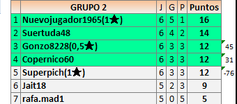 Deja un comentarioEn está página se irán publicando los resultados de las diferentes partidas, siendo ambos jugadores responsables de subirlos o de comprobar que ya hayan sido publicados insertando un COMENTARIO en la parte inferior de la pantalla (opción “Deja tu comentario”), indicando el nombre de los dos jugadores y los puntos obtenidos en la partida.