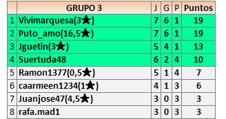 Deja un comentarioEn está página se irán publicando los resultados de las diferentes partidas, siendo ambos jugadores responsables de subirlos o de comprobar que ya hayan sido publicados insertando un COMENTARIO en la parte inferior de la pantalla (opción “Deja tu comentario”), indicando el nombre de los dos jugadores y los puntos obtenidos en la partida.