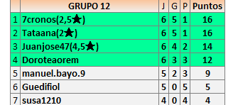 Deja un comentarioEn está página se irán publicando los resultados de las diferentes partidas, siendo ambos jugadores responsables de subirlos o de comprobar que ya hayan sido publicados insertando un COMENTARIO en la parte inferior de la pantalla (opción “Deja tu comentario”), indicando el nombre de los dos jugadores y los puntos obtenidos en la partida.