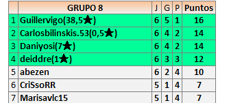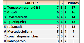 Deja un comentarioEn está página se irán publicando los resultados de las diferentes partidas, siendo ambos jugadores responsables de subirlos o de comprobar que ya hayan sido publicados insertando un COMENTARIO en la parte inferior de la pantalla (opción “Deja tu comentario”), indicando el nombre de los dos jugadores y los puntos obtenidos en la partida.