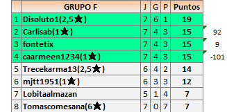 Deja un comentarioEn está página se irán publicando los resultados de las diferentes partidas, siendo ambos jugadores responsables de subirlos o de comprobar que ya hayan sido publicados insertando un COMENTARIO en la parte inferior de la pantalla (opción “Deja tu comentario”), indicando el nombre de los dos jugadores y los puntos obtenidos en la partida.