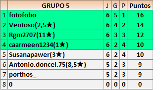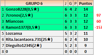 Deja un comentarioEn está página se irán publicando los resultados de las diferentes partidas, siendo ambos jugadores responsables de subirlos o de comprobar que ya hayan sido publicados insertando un COMENTARIO en la parte inferior de la pantalla (opción “Deja tu comentario”), indicando el nombre de los dos jugadores y los puntos obtenidos en la partida.