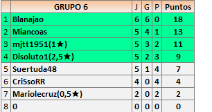 Deja un comentarioEn está página se irán publicando los resultados de las diferentes partidas, siendo ambos jugadores responsables de subirlos o de comprobar que ya hayan sido publicados insertando un COMENTARIO en la parte inferior de la pantalla (opción “Deja tu comentario”), indicando el nombre de los dos jugadores y los puntos obtenidos en la partida.