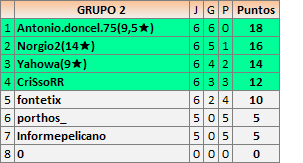 Deja un comentarioEn está página se irán publicando los resultados de las diferentes partidas, siendo ambos jugadores responsables de subirlos o de comprobar que ya hayan sido publicados insertando un COMENTARIO en la parte inferior de la pantalla (opción “Deja tu comentario”), indicando el nombre de los dos jugadores y los puntos obtenidos en la partida.