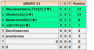 Deja un comentarioEn está página se irán publicando los resultados de las diferentes partidas, siendo ambos jugadores responsables de subirlos o de comprobar que ya hayan sido publicados insertando un COMENTARIO en la parte inferior de la pantalla (opción “Deja tu comentario”), indicando el nombre de los dos jugadores y los puntos obtenidos en la partida.