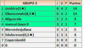 Deja un comentarioEn está página se irán publicando los resultados de las diferentes partidas, siendo ambos jugadores responsables de subirlos o de comprobar que ya hayan sido publicados insertando un COMENTARIO en la parte inferior de la pantalla (opción “Deja tu comentario”), indicando el nombre de los dos jugadores y los puntos obtenidos en la partida.