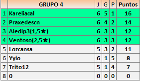 Deja un comentarioEn está página se irán publicando los resultados de las diferentes partidas, siendo ambos jugadores responsables de subirlos o de comprobar que ya hayan sido publicados insertando un COMENTARIO en la parte inferior de la pantalla (opción “Deja tu comentario”), indicando el nombre de los dos jugadores y los puntos obtenidos en la partida.