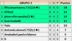 Deja un comentarioEn está página se irán publicando los resultados de las diferentes partidas, siendo ambos jugadores responsables de subirlos o de comprobar que ya hayan sido publicados insertando un COMENTARIO en la parte inferior de la pantalla (opción “Deja tu comentario”), indicando el nombre de los dos jugadores y los puntos obtenidos en la partida.