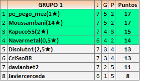 Deja un comentarioEn está página se irán publicando los resultados de las diferentes partidas, siendo ambos jugadores responsables de subirlos o de comprobar que ya hayan sido publicados insertando un COMENTARIO en la parte inferior de la pantalla (opción “Deja tu comentario”), indicando el nombre de los dos jugadores y los puntos obtenidos en la partida.
