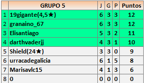 Deja un comentarioEn está página se irán publicando los resultados de las diferentes partidas, siendo ambos jugadores responsables de subirlos o de comprobar que ya hayan sido publicados insertando un COMENTARIO en la parte inferior de la pantalla (opción “Deja tu comentario”), indicando el nombre de los dos jugadores y los puntos obtenidos en la partida.