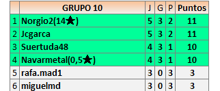 Deja un comentarioEn está página se irán publicando los resultados de las diferentes partidas, siendo ambos jugadores responsables de subirlos o de comprobar que ya hayan sido publicados insertando un COMENTARIO en la parte inferior de la pantalla (opción “Deja tu comentario”), indicando el nombre de los dos jugadores y los puntos obtenidos en la partida.
