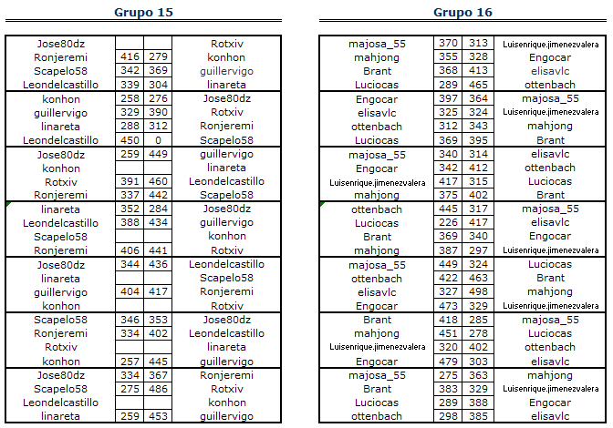 Deja un comentarioEn está página se irán indicando los resultados de las diferentes partidas. Lo único que tienes que hacer es insertar un comentario en la parte inferior de la pantalla (“Deja tu comentario”) indicando el nombre de los dos usuarios y los puntos obtenidos por ambos en la partida. El vencedor de cada partida será el encargado de comunicar el resultado en este apartado.
