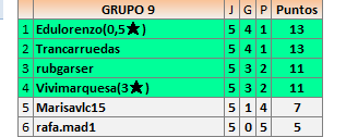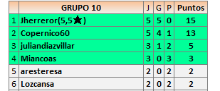 Deja un comentarioEn está página se irán publicando los resultados de las diferentes partidas, siendo ambos jugadores responsables de subirlos o de comprobar que ya hayan sido publicados insertando un COMENTARIO en la parte inferior de la pantalla (opción “Deja tu comentario”), indicando el nombre de los dos jugadores y los puntos obtenidos en la partida.