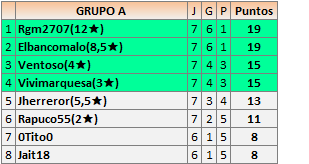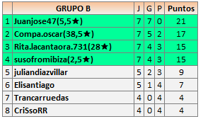 Deja un comentarioEn está página se irán publicando los resultados de las diferentes partidas, siendo ambos jugadores responsables de subirlos o de comprobar que ya hayan sido publicados insertando un COMENTARIO en la parte inferior de la pantalla (opción “Deja tu comentario”), indicando el nombre de los dos jugadores y los puntos obtenidos en la partida.