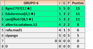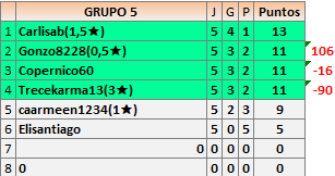 Deja un comentarioEn está página se irán publicando los resultados de las diferentes partidas, siendo ambos jugadores responsables de subirlos o de comprobar que ya hayan sido publicados insertando un COMENTARIO en la parte inferior de la pantalla (opción “Deja tu comentario”), indicando el nombre de los dos jugadores y los puntos obtenidos en la partida.