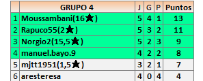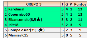 Deja un comentarioEn está página se irán publicando los resultados de las diferentes partidas, siendo ambos jugadores responsables de subirlos o de comprobar que ya hayan sido publicados insertando un COMENTARIO en la parte inferior de la pantalla (opción “Deja tu comentario”), indicando el nombre de los dos jugadores y los puntos obtenidos en la partida.