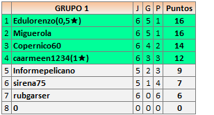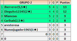 Deja un comentarioEn está página se irán publicando los resultados de las diferentes partidas, siendo ambos jugadores responsables de subirlos o de comprobar que ya hayan sido publicados insertando un COMENTARIO en la parte inferior de la pantalla (opción “Deja tu comentario”), indicando el nombre de los dos jugadores y los puntos obtenidos en la partida.