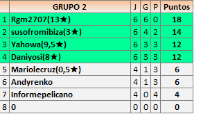 Deja un comentarioEn está página se irán publicando los resultados de las diferentes partidas, siendo ambos jugadores responsables de subirlos o de comprobar que ya hayan sido publicados insertando un COMENTARIO en la parte inferior de la pantalla (opción “Deja tu comentario”), indicando el nombre de los dos jugadores y los puntos obtenidos en la partida.