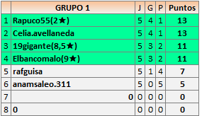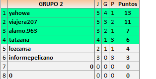Deja un comentarioEn está página se irán publicando los resultados de las diferentes partidas, siendo ambos jugadores responsables de subirlos o de comprobar que ya hayan sido publicados insertando un COMENTARIO en la parte inferior de la pantalla (opción “Deja tu comentario”), indicando el nombre de los dos jugadores y los puntos obtenidos en la partida.