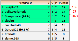 Deja un comentarioEn está página se irán publicando los resultados de las diferentes partidas, siendo ambos jugadores responsables de subirlos o de comprobar que ya hayan sido publicados insertando un COMENTARIO en la parte inferior de la pantalla (opción “Deja tu comentario”), indicando el nombre de los dos jugadores y los puntos obtenidos en la partida.