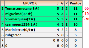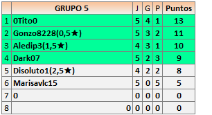 Deja un comentarioEn está página se irán publicando los resultados de las diferentes partidas, siendo ambos jugadores responsables de subirlos o de comprobar que ya hayan sido publicados insertando un COMENTARIO en la parte inferior de la pantalla (opción “Deja tu comentario”), indicando el nombre de los dos jugadores y los puntos obtenidos en la partida.