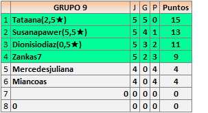 Deja un comentarioEn está página se irán publicando los resultados de las diferentes partidas, siendo ambos jugadores responsables de subirlos o de comprobar que ya hayan sido publicados insertando un COMENTARIO en la parte inferior de la pantalla (opción “Deja tu comentario”), indicando el nombre de los dos jugadores y los puntos obtenidos en la partida.