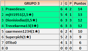Deja un comentarioEn está página se irán publicando los resultados de las diferentes partidas, siendo ambos jugadores responsables de subirlos o de comprobar que ya hayan sido publicados insertando un COMENTARIO en la parte inferior de la pantalla (opción “Deja tu comentario”), indicando el nombre de los dos jugadores y los puntos obtenidos en la partida.