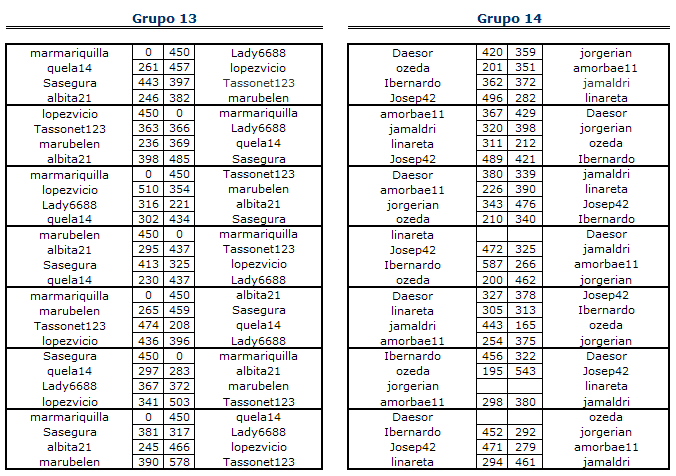 Deja un comentarioEn está página se irán indicando los resultados de las diferentes partidas. Lo único que tienes que hacer es insertar un comentario en la parte inferior de la pantalla (“Deja tu comentario”) indicando el nombre de los dos usuarios y los puntos obtenidos por ambos en la partida. El vencedor de cada partida será el encargado de comunicar el resultado en este apartado.